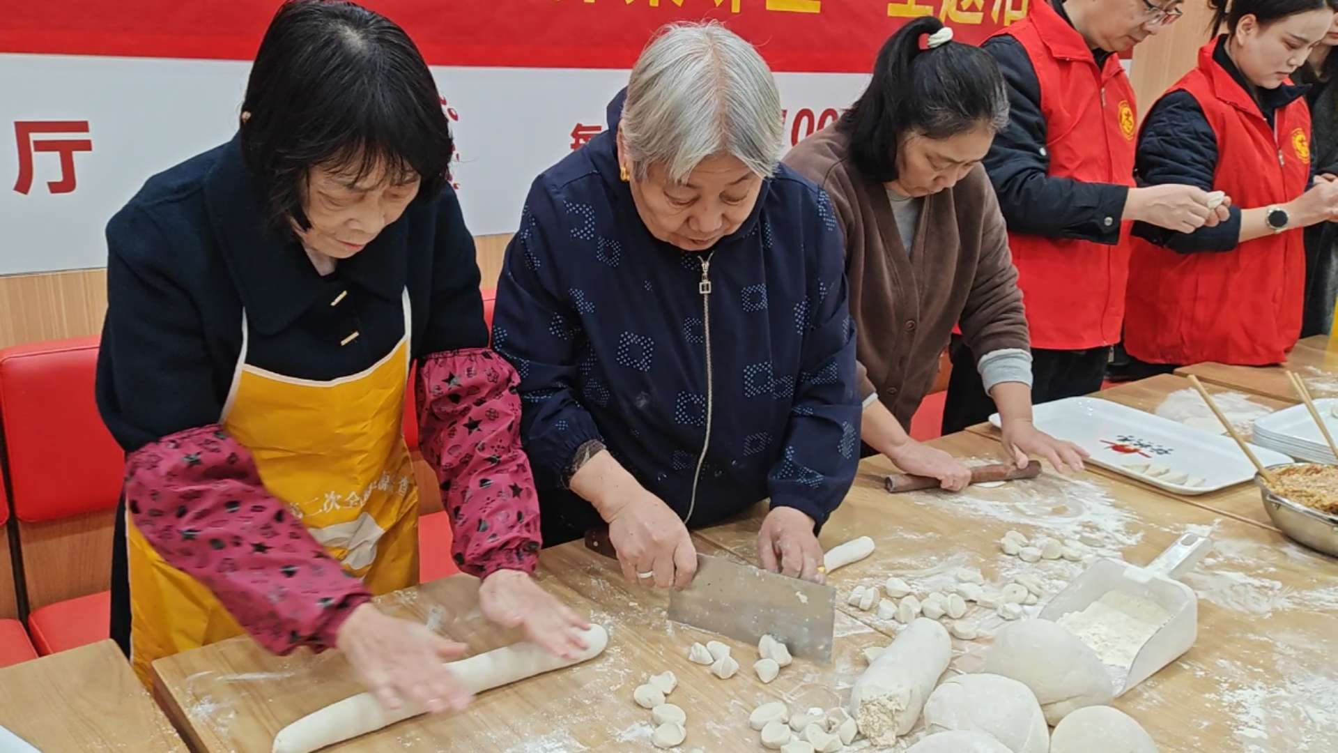 店内暖意融融,案板上整齐码放着雪白的面团和鲜香的肉馅。身着红马甲的志愿者与老人们分工协作,揉面、擀皮、包馅、煮饺子……动作娴熟而默契。“饺子来喽!”随着一声吆喝,志愿者将煮好的饺子端上桌,老人们围坐品尝,纷纷点赞。居民刘阿姨边吃边感慨:“这饺子皮薄馅大,比家里包得还香!”