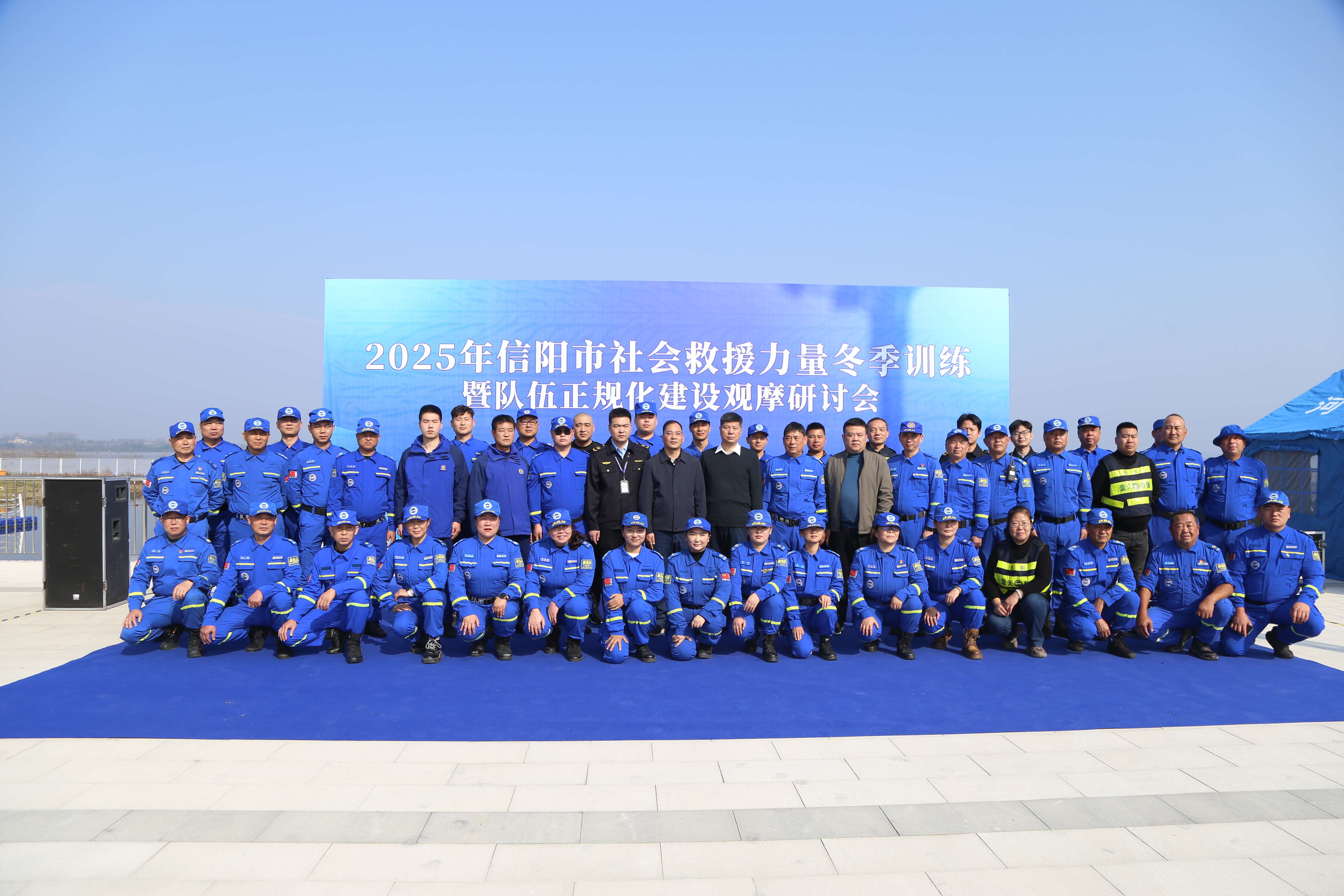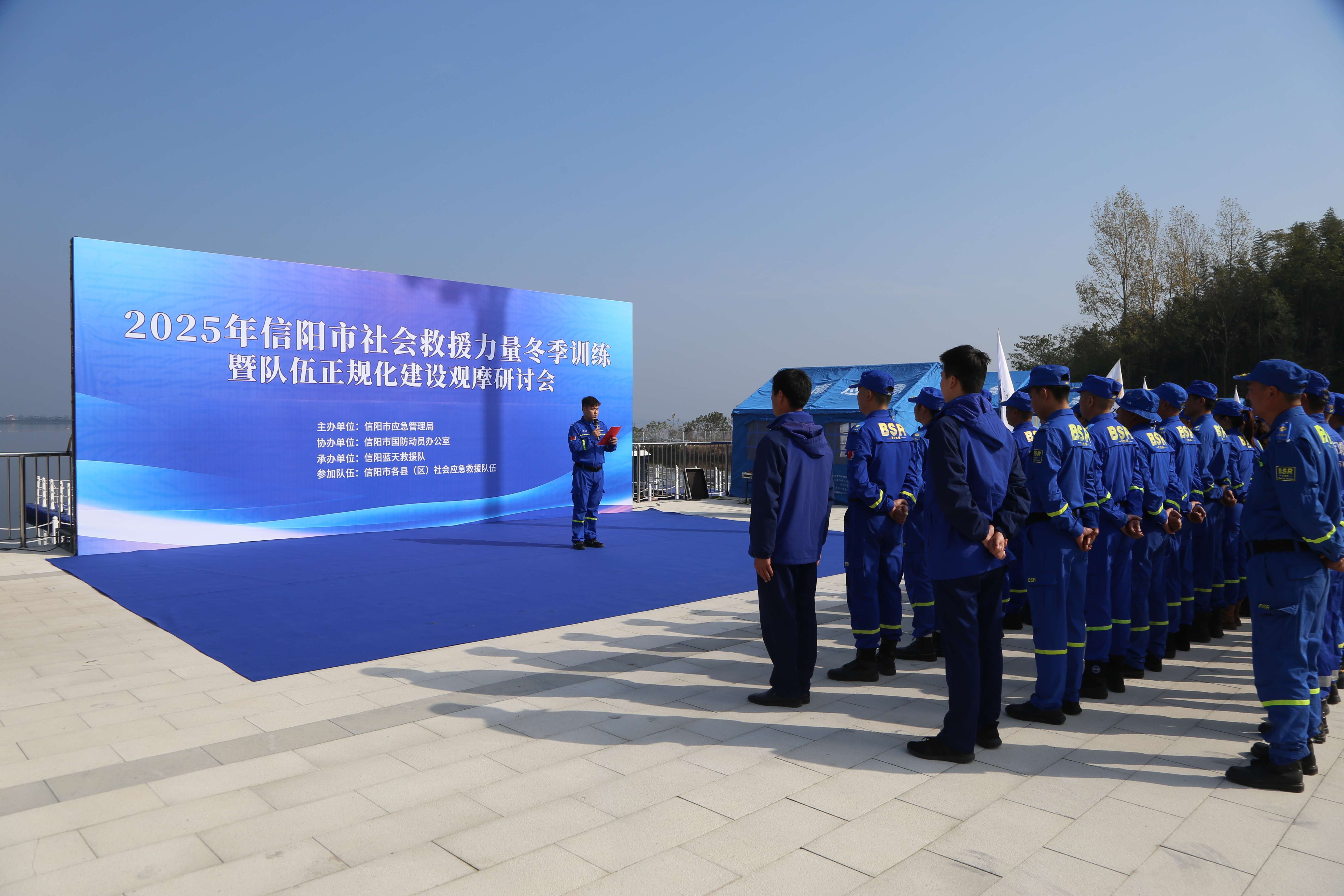 11月15日至16日,2025年信阳市社会救援力量冬季训练暨队伍正规化建设观摩研讨会在出山店水库星河渡码头举行,旨在提升全市社会应急救援力量的专业化、实战化和正规化水平。