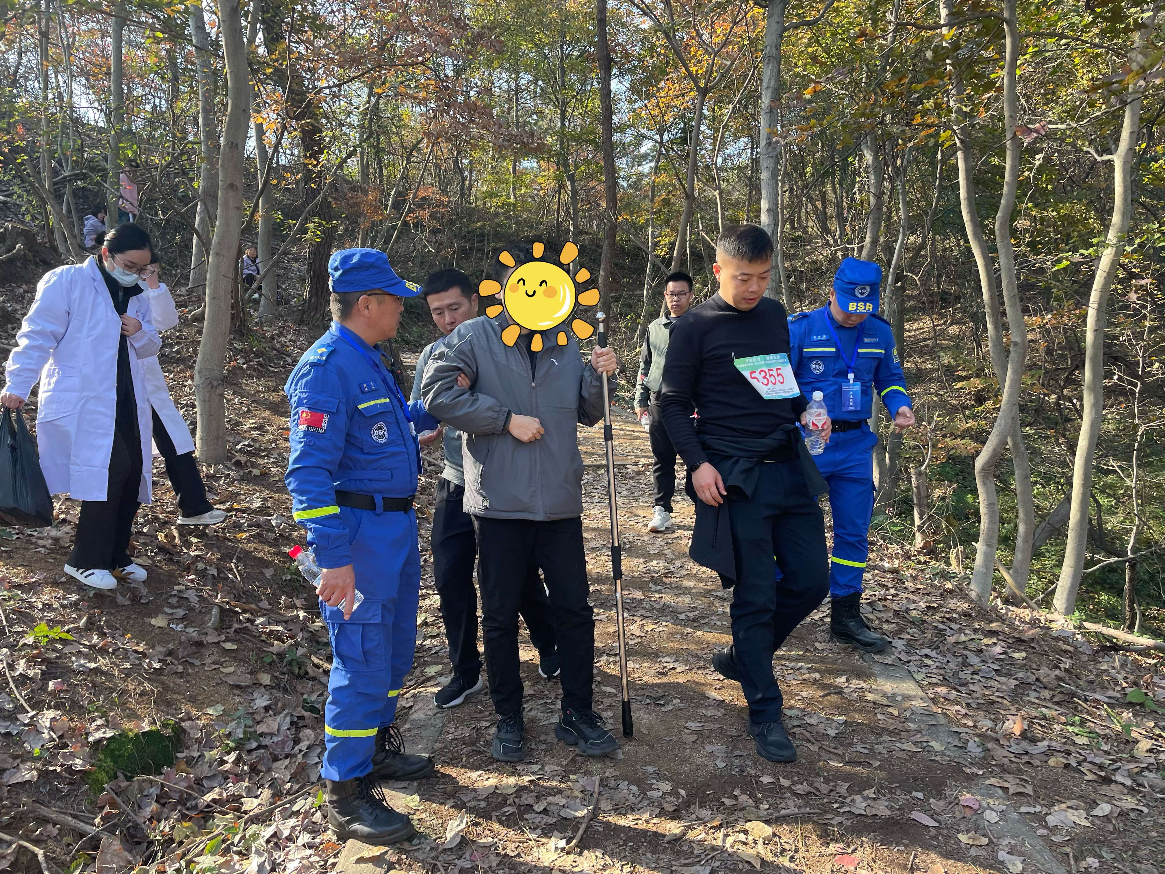 赛事当日,来自信阳蓝天救援队、浉河区蓝天救援队、平桥区蓝天救援队、淮滨县蓝天救援队、罗山县蓝天救援协会5支救援队员们提前就位,统一着装、精神专注,分布在各关键路段与险要节点,全程密切监控参与者的身体状况与行进安全。其间,一名登山者突发不适,出现心慌无力、面色苍白等症状。救援队员迅速响应,第一时间联系120医护人员到场监测,待其体征平稳后,稳妥护送至安全区域。