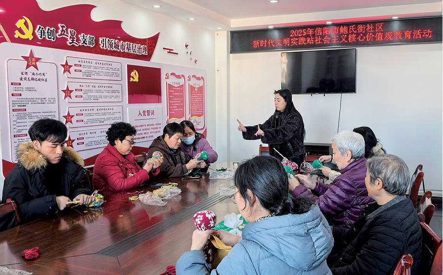 11月28日,浉河区老城街道鲍氏街社区联合辖区共建单位郑州银行共同举办了“情暖社区 守护安康”主题活动。活动中,社区居民和银行工作人员围坐一起,用彩布、艾草和丝线等材料制作艾草槌,既传承了传统养生文化,又增进了温情交流。