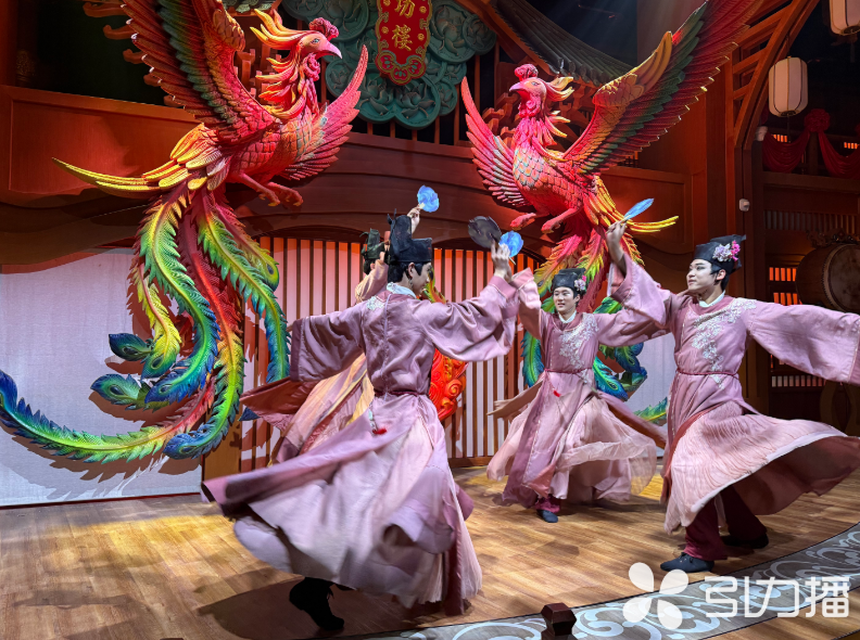 同时,观众实现从“看戏人”成为“入戏者”的蜕变,刚入场就会领到一盏鱼灯,跟着“落霞”或“天青”色鱼灯分队,可与宋装NPC戴簪花,在酒肆茶摊间偶遇顶缸、变脸等宋代百戏,甚至能亲手参与剧情推进。此外,中国美院匠心打造“一幕江南”建筑载体,搭配宋词主题八色空间长廊,随手拍都是氛围感大片。