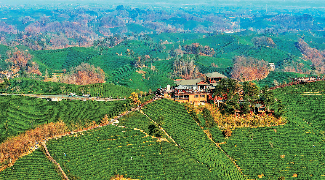 冬日的信阳,茶山依旧苍翠。俯瞰茶乡,游客或以青山为背景拍照留念,或闲坐露台品一杯香醇的信阳毛尖,尽享茶乡的温暖与惬意。