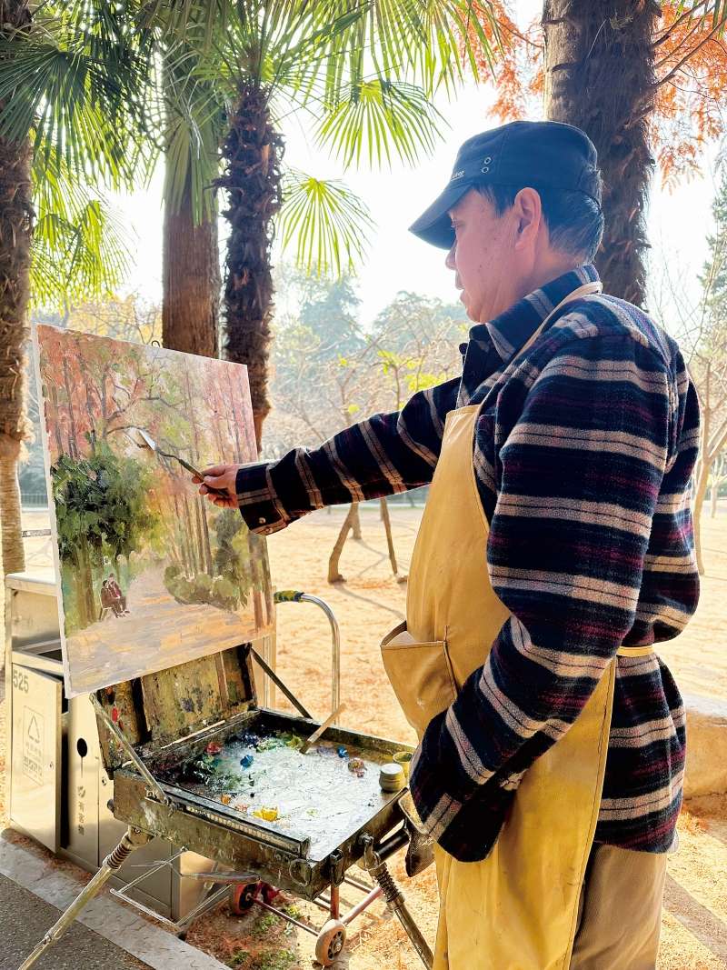 阳光斜斜穿过枝丫,投下交错的影子,几株倔强的银杏枝头上还悬着零星的叶片,常青的棕榈为这略显萧瑟的冬景添上一抹厚重的底色……冬日里,信阳城区周边大大小小的公园成为天然的艺术园地,吸引着游客和市民。图为12月6日,一位老者在浉河公园内用油画描绘公园小景。