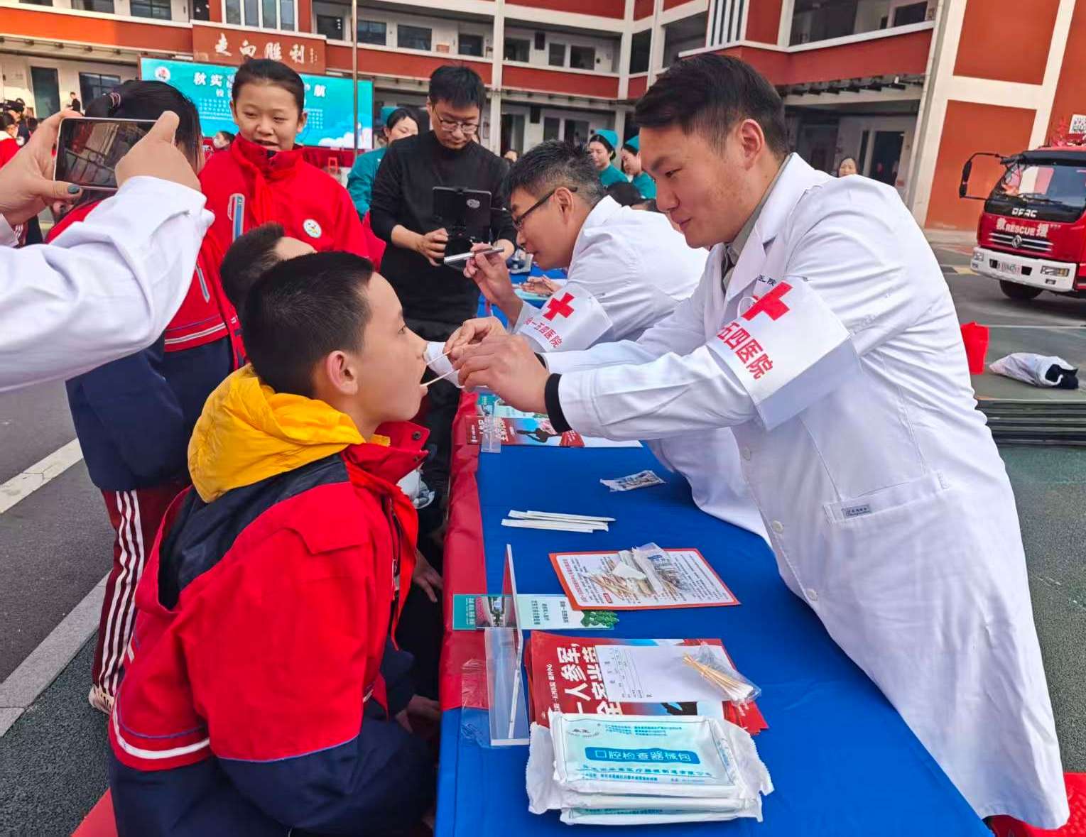 宣讲结束后,展台体验区迅速成为校园里最热闹的场所。信阳一五四医院的义诊展台前,医护人员耐心为孩子们检查视力、口腔,并细心叮嘱用眼卫生;市公安局特巡警支队的装备展示区人气十足,无人机、拐弯枪架、穿墙雷达、防爆车等特种设备整齐陈列,引来孩子们阵阵惊叹;市消防救援支队的消防车也吸引了众多目光。