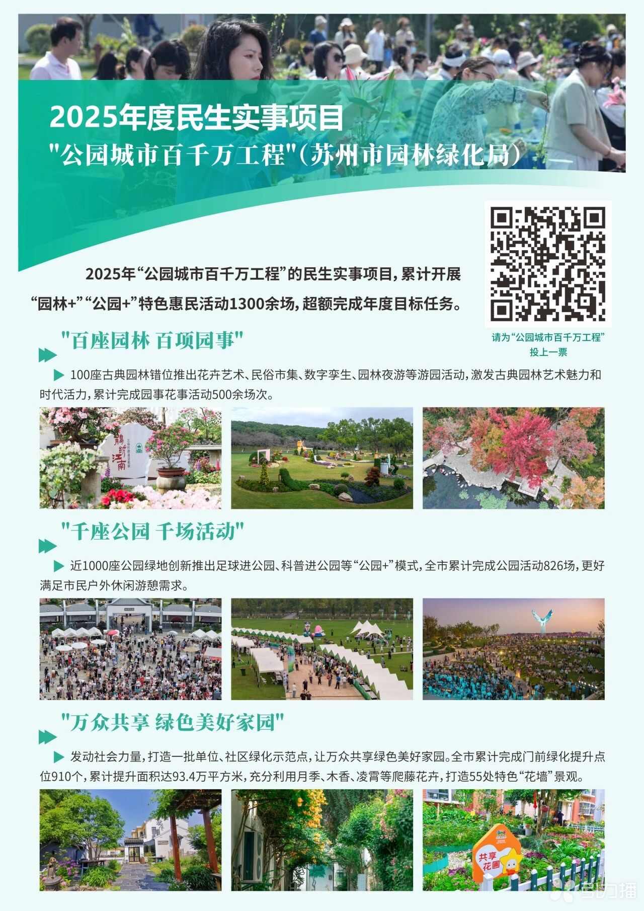 目前,备受市民关注的“苏州十大民心工程”推选活动正在进行中,“公园城市百千万工程”已作为重要民生成果列入候选。点赞通道已于12月10日正式开启,将持续至12月19日。活动期间,市民每日可通过指定平台为支持的项目投票,并有机会赢取手机话费奖品。(苏报融媒记者 凌欣炜/文)