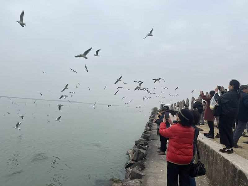 上周末,市民沈小姐专程来到吴中区光福镇冲山村的一家临湖咖啡店。捧着热美式望向窗外,成群的红嘴鸥正掠过湖面,她几乎看入了神。“下午2点到4点光线最佳,鸥群也活跃,偶尔有船只驶过,它们会追着船尾飞,画面特别美。”事后,她在社交平台分享的照片与心得,又为这场“鸥遇”增添了一抹浪漫的注脚。