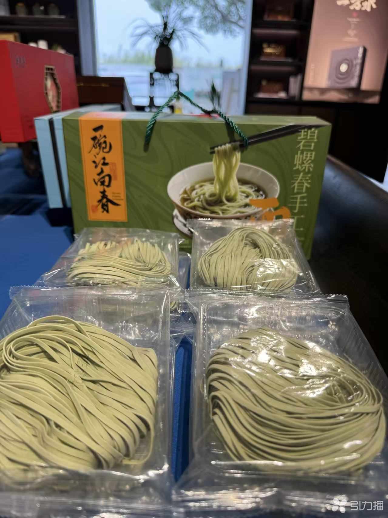 今年11月,东山茶厂又玩出跨界新花样,推出了碧螺春面,将非遗技艺从“茶杯”搬向“餐桌”,成为市场焦点。柳荣伟介绍,碧螺春面的研发源于东山人面食习惯与茶产业的结合,团队经数千斤面粉反复试验确定最佳配比,精选春茶磨粉入面,0香精0色素,煮后茶香与汤鲜交融,独立锁鲜包装留存春味。这款产品开辟了茶产业“主食级”赛道,为茶农增添增收路径。