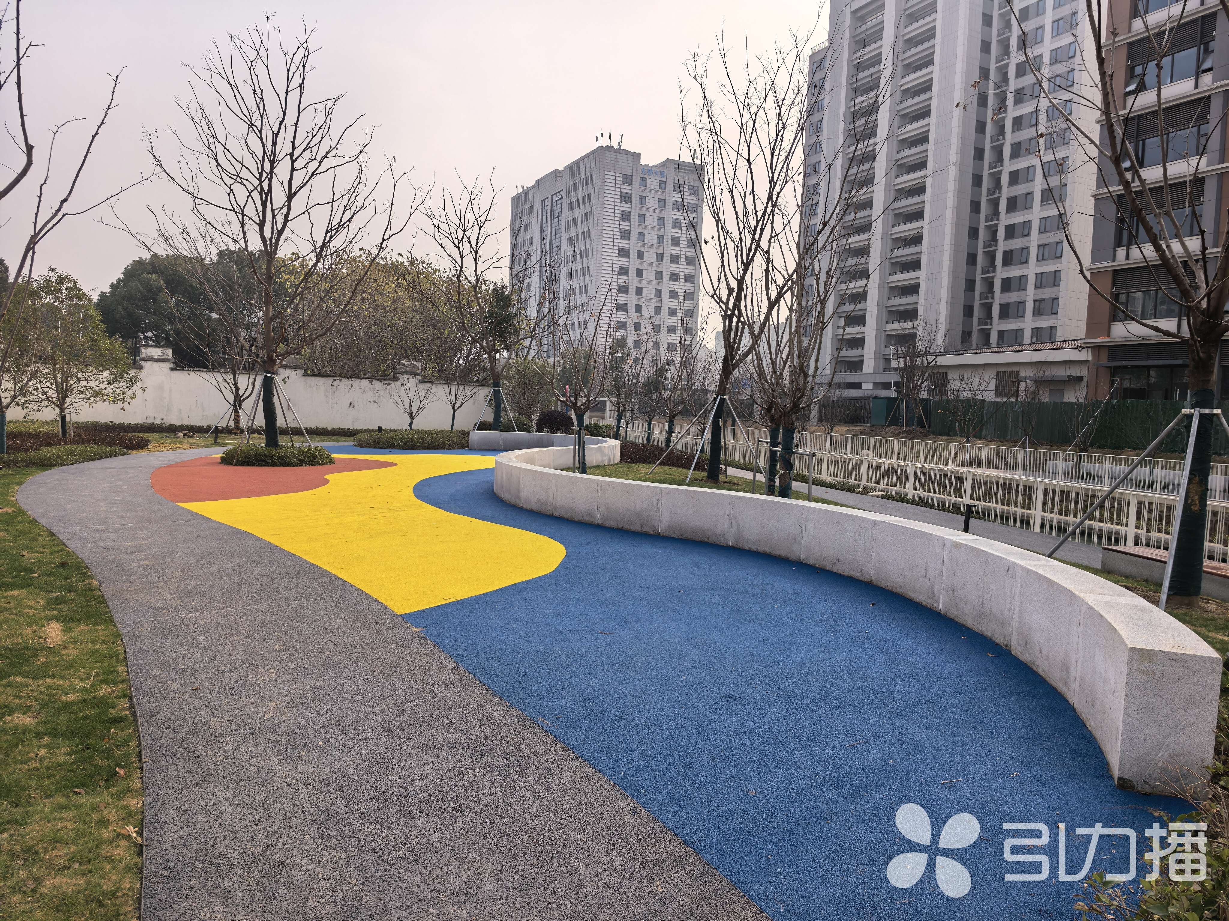 晴翠璟园周边、朗月滨河北侧沿河景观及绿道,总面积约1.9万平方米,其中绿化面积近1.7万平方米,项目整体设计风格以清爽简约为主,采用“乔木+草坪”的疏朗配置,搭配银杏、樱花,营造了开阔通透的活动空间。
