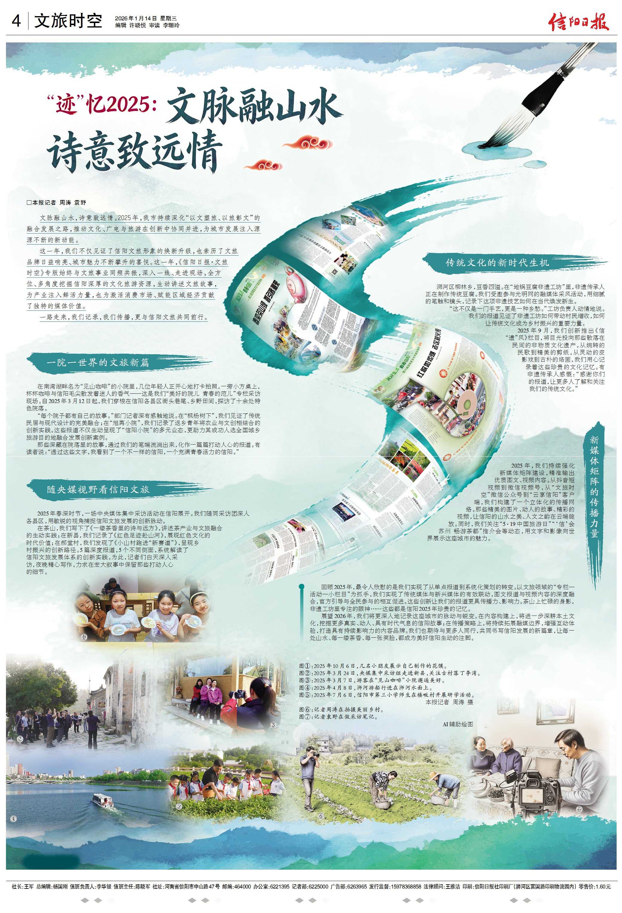 这一年,我们不仅见证了信阳文旅形象的焕新升级,也亲历了文旅品牌日益响亮、城市魅力不断攀升的喜悦。这一年,《信阳日报·文旅时空》专版始终与文旅事业同频共振,深入一线、走进现场,全方位、多角度挖掘信阳深厚的文化旅游资源,生动讲述文旅故事,为产业注入鲜活力量,也为激活消费市场、赋能区域经济贡献了独特的媒体价值。