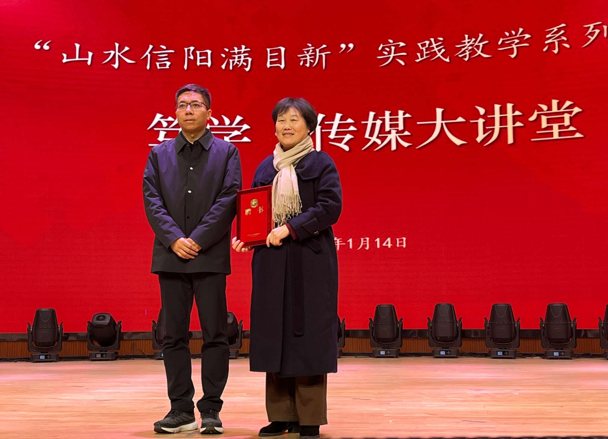活动现场,学校向新县赠送优秀摄影作品,与会人员共同观展交流,现场氛围热烈。校长郭立场为焦素娥教授颁发“兼职教授”聘书。