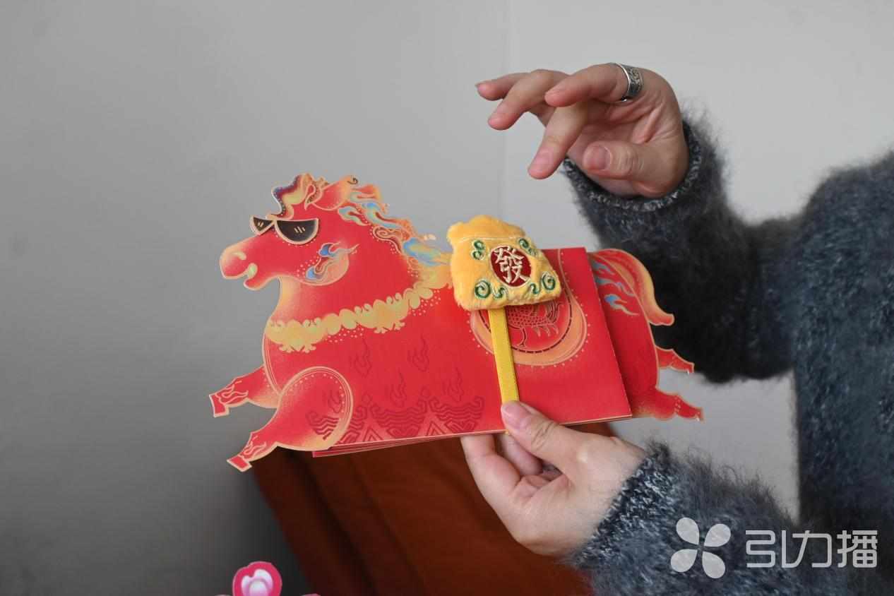 “这个带松紧绳的毛绒马鞍也可以用作发绳结。”杨文丹补充道,“我们希望做出来的东西既有审美,又兼具实用性。每年和‘纸加’合作开发的新年红包,都希望它在‘纳财’之余,能有其他用途,不至于造成浪费。”