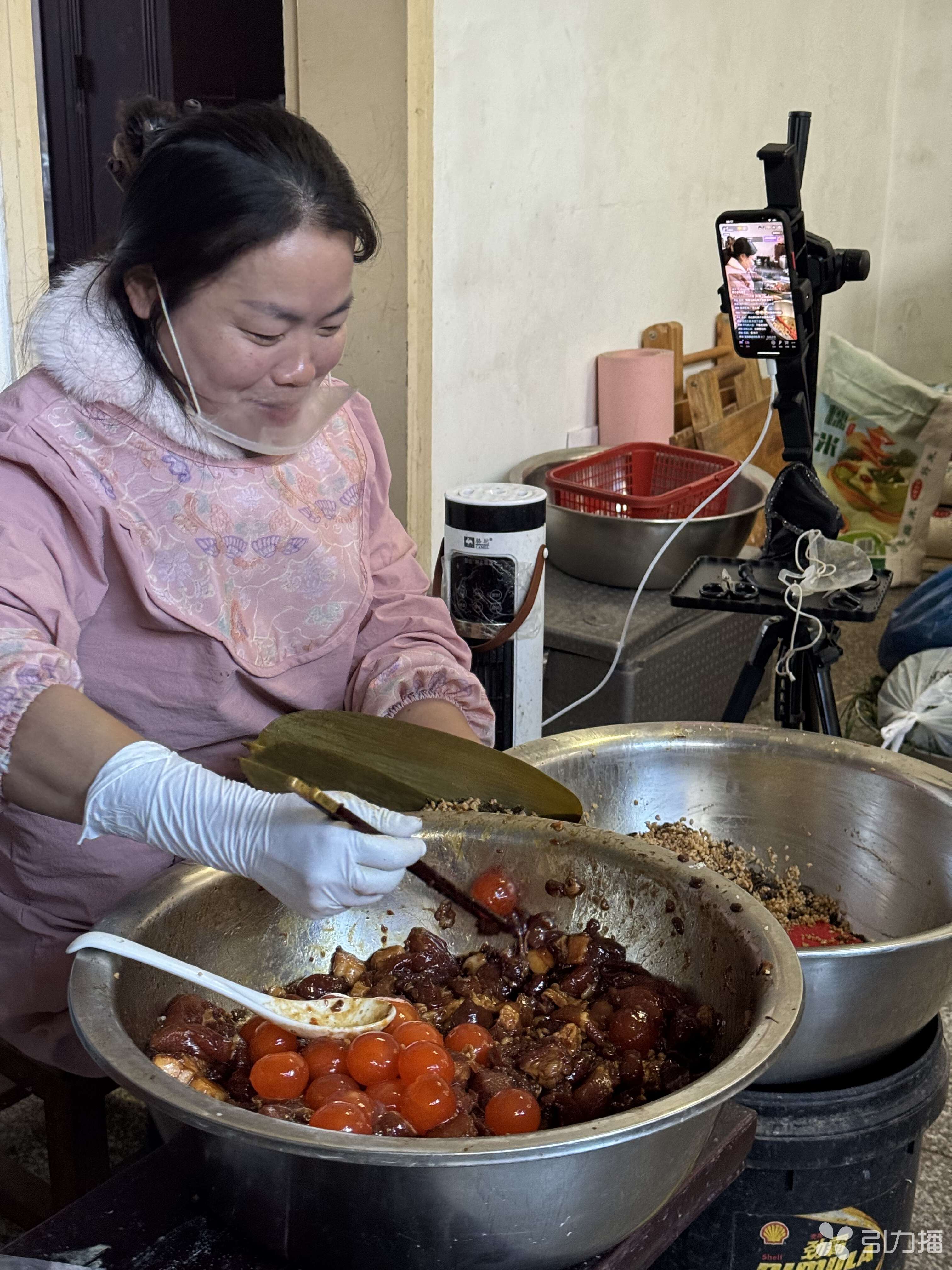 走进村民周晓斌的家,她正对着手机镜头直播。屏幕那头,粉丝们正在围观她的“绝活”——七星粽。只见她熟练地叠起4片宽大的粽叶,填入糯米,一口气塞进7个油润的咸蛋黄,再铺满大块鲜肉,手指翻飞间,一只巨无霸粽子瞬间成型。“这也太实诚了!”直播间里惊叹声一片。