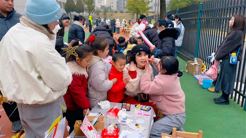 威风凛凛的舞狮队穿梭校园,锣鼓声阵阵烘托出浓厚年味,孩子们围着狮子拍手欢呼,近距离感受传统民俗的震撼;变脸表演妙趣横生,演员切换脸谱的绝技引得大家连连称奇;小丑演员则带着滑稽的装扮与趣味道具登场,与孩子们亲切互动、派送小礼物,现场笑声不断。