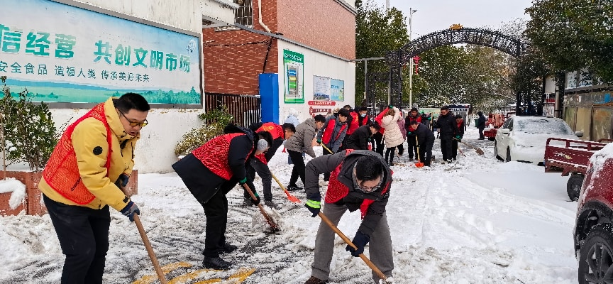 1月20日清晨,平桥区城东街道辖区的“红色身影”,在白雪映衬下格外醒目。身穿红色马甲的志愿者们,手持铁锹、扫帚等除雪工具,清扫城市主干道及农贸市场、社区食堂等重点区域积雪,为市民出行铺就了一条条安全、畅通的“暖心路”。