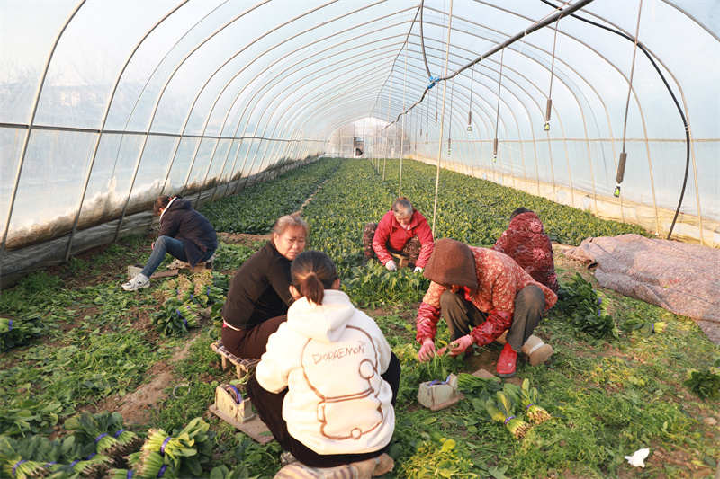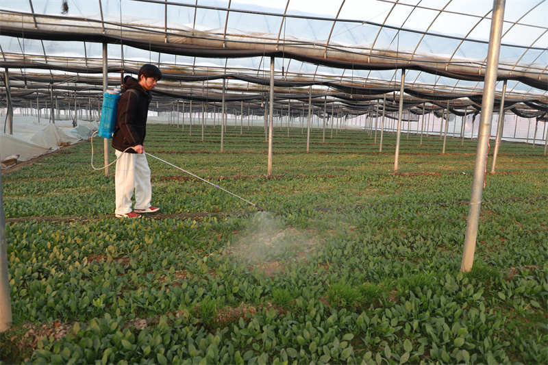 1月22日,在平桥区甘岸街道繁高农业种植专业合作社的百亩蔬菜大棚内,菠菜、黄心菜、芹菜长势喜人。信阳市农业技术服务中心经济作物科高级农艺师黄华正俯身田间,为种植户现场讲解雨雪天气后的蔬菜田间管理技巧。