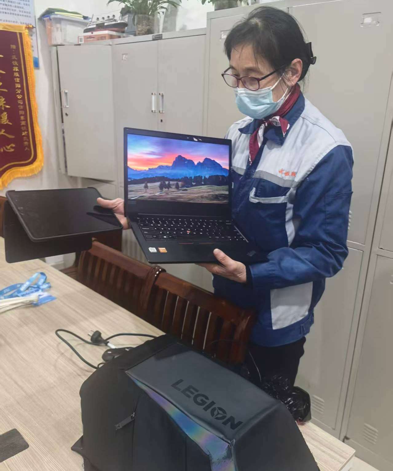1月18日晚,在大雪极端天气下刚完成撒盐除雪作业的祝文秀在候车二厅进行日常保洁时,在座位间发现一个无人看管的背包。她立即停下工作,仔细查看包外,未发现失主信息。考虑到包内可能有重要物品,失主一定十分着急,她第一时间将背包送至车站服务台并协助登记。经查验,包内装有一台笔记本电脑和一台平板电脑,价值不菲。服务台工作人员通过包内线索迅速联系上失主董先生,顺利归还物品。
