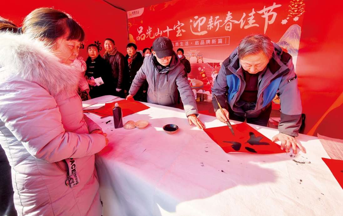 送春联、看花鼓戏、逛大集、购年货……昨日,光山县“品光山十宝,迎新春佳节”年货大集活动在司马光广场举行。该活动精准对接群众节前采购需求,为打造县域农业特色品牌提供平台,同时呼应近期“光山十宝”区域公共品牌获批喜讯,宣告该县“光山十宝”农产品协会正式履职。图为活动现场上,县文联组织开展义写春联活动。