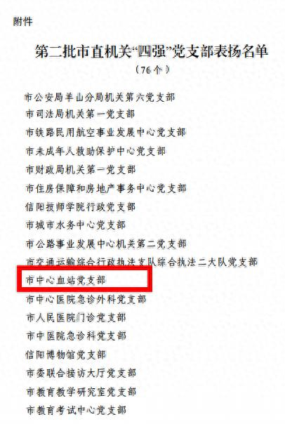 近日,信阳市中心血站党支部被授予第二批市直机关“四强”党支部荣誉称号。此项荣誉既是对信阳市中心血站党支部在强化政治引领、夯实组织基础、锻造过硬队伍、发挥表率作用等方面扎实成效的充分肯定,也是对其持续推动党建工作与采供血业务深度融合、有力服务全市血液安全保障大局的生动体现。