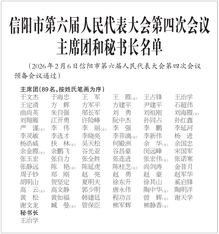 信阳市第六届人民代表大会第四次会议主席团和秘书长名单