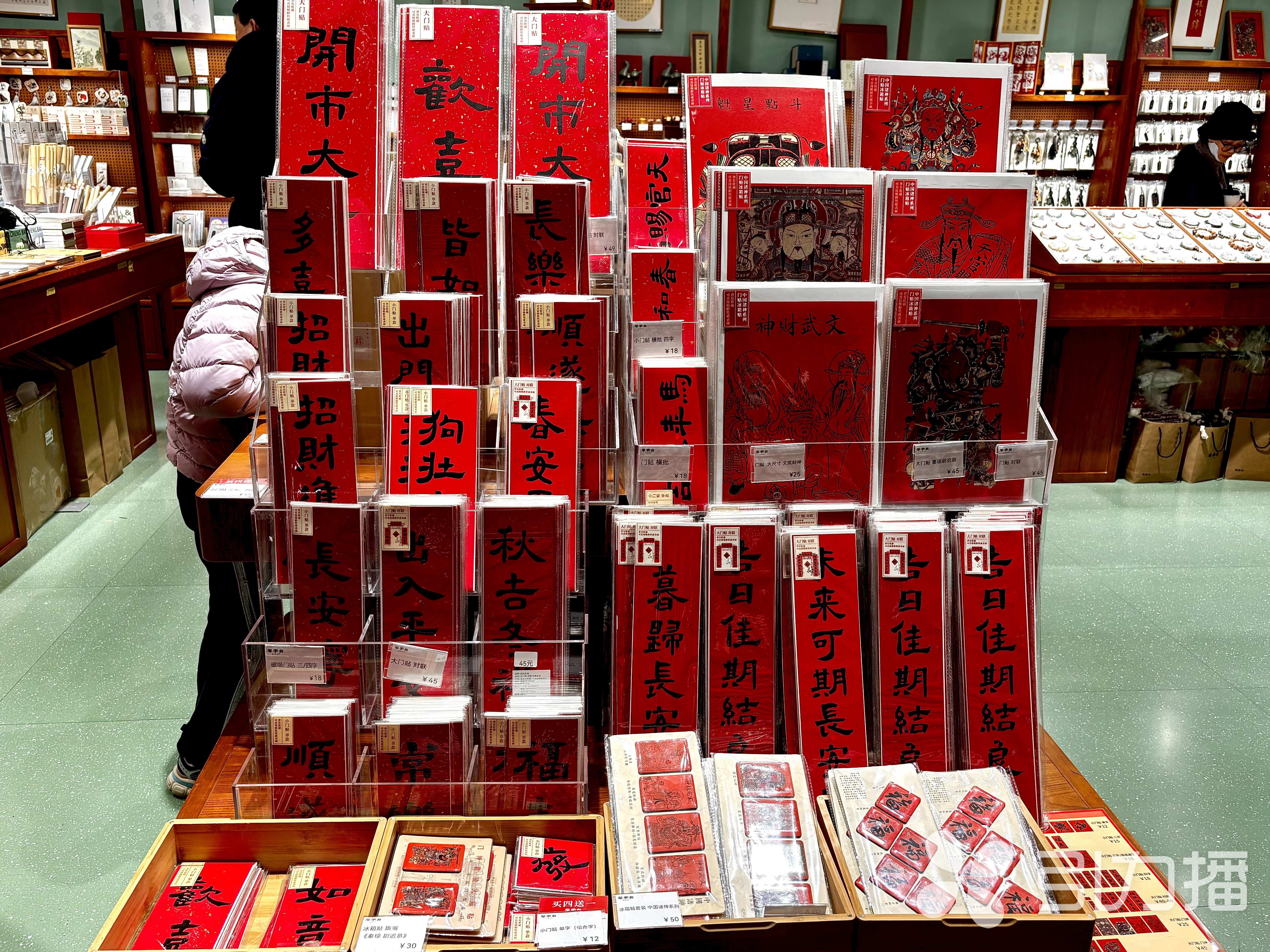 在文创品牌“写字台”里,25岁的插画师小林正对着一排创意书法冰箱贴,仔细挑选。“我选了‘骐骥开新运’和‘平安喜乐’。把对联贴在冰箱上,既好看又吉利,拍照发朋友圈也特别出片。”她笑着说。在这里,笔墨丹青“走”出了书房,化为打破次元壁的书法空间——除了传统红纸对联,还有手工雕刻的马年窗花、美好寓意的团扇书签,让祝福以最潮流的方式“贴”进现代生活。