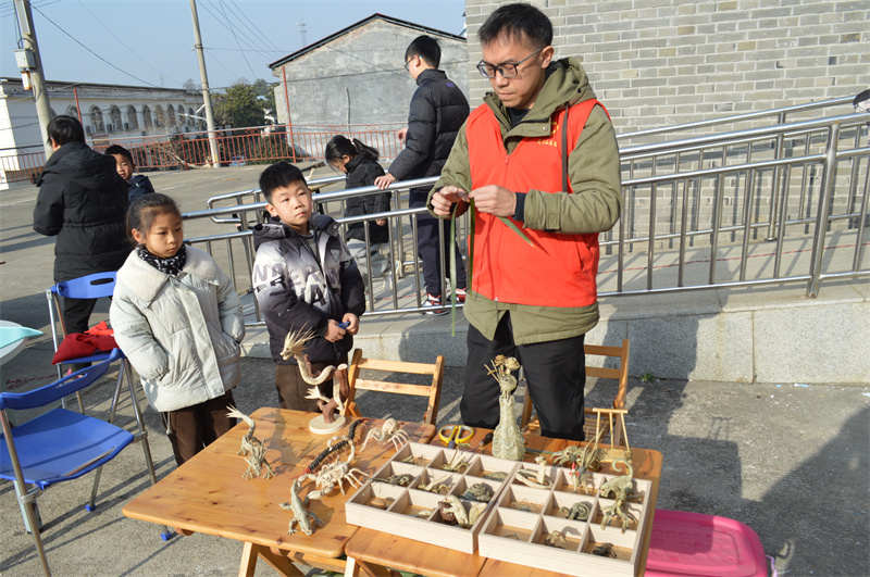 欢快的广场舞《欢天喜地喝喜酒过新年》拉开活动序幕,快板《党的二十大精神赞美篇》、戏曲小品《亲家母你坐下》、扇子舞《中华全家福》等十个节目轮番登场,掌声笑声此起彼伏。节目中特别穿插了移风易俗趣味问答,乡亲们抢答踊跃,文明理念在轻松互动中入脑入心。非遗体验区,花馍传承人盛雁手把手教孩子们捏出鲤鱼、小马造型的花馍。棕编艺人谢强手指翻飞,几片碧绿的棕榈叶转眼化作活灵活现的小蚂蚱。