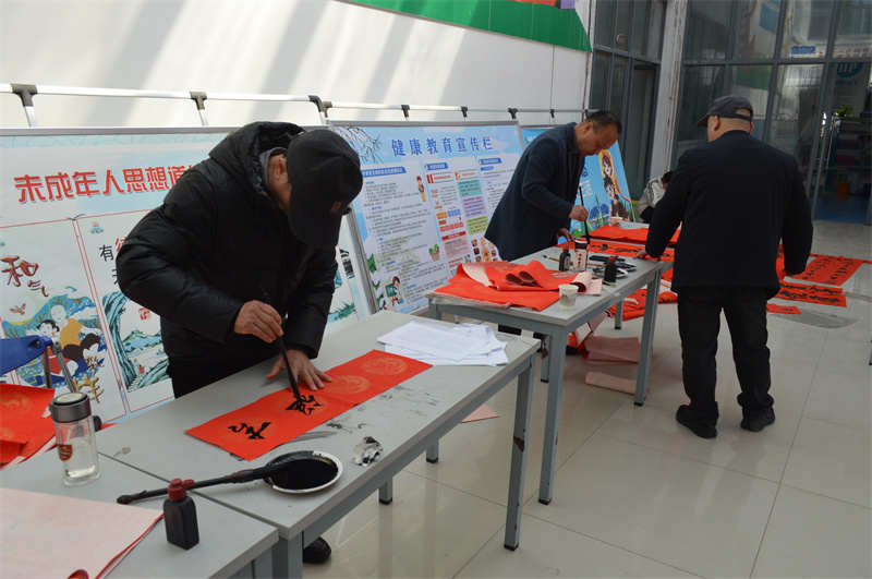 春联书写区,羊山新区人大政协办邀请的书法家们挥毫泼墨,笔走龙蛇,春联和“福”字被乡亲们如获至宝地捧回家;义诊服务台前,乡卫生院医生为老人量血压、讲常识;信阳市海事航务事务中心的志愿者们也穿梭在人群中,协助秩序维护、发放宣传资料,把交通安全知识融入新春祝福。