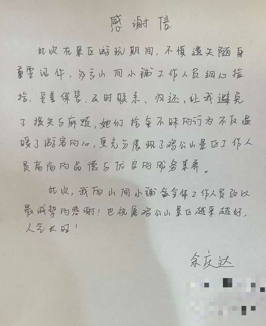 这份珍贵的感谢信,是对景区一线员工拾金不昧、主动服务精神的最生动肯定。近年来,鸡公山景区始终致力于提升服务质量,加强员工职业道德建设,此次“山间小铺”工作人员的善行义举,正是景区常态化文明服务的缩影与成果体现。