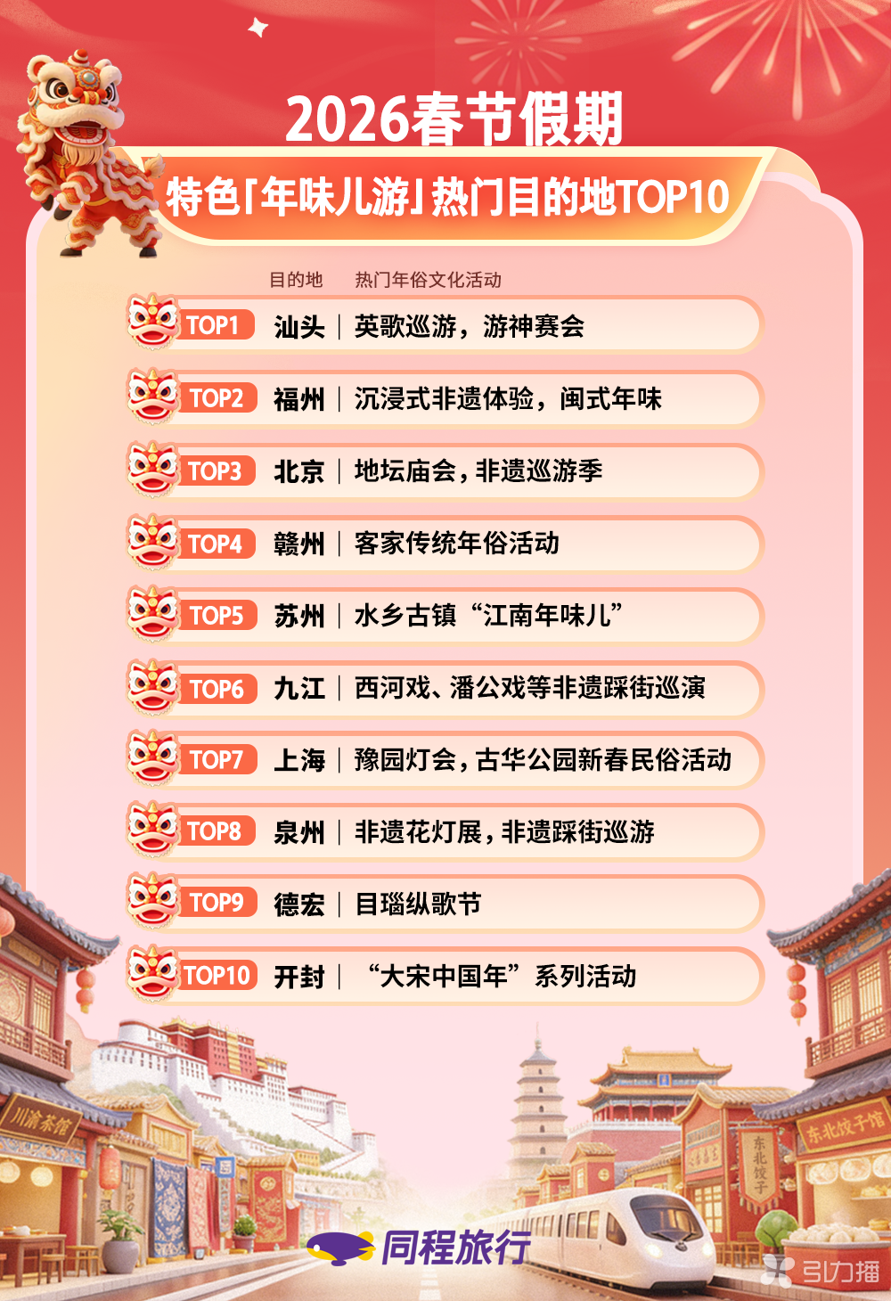 “史上最长春节假期”已经收官,在假期出游高峰阶段,全国多个知名景区“一票难求”,周边游、长线游等旅游消费亮点纷呈。2月23日,同程旅行发布《2026春节假期旅游消费盘点报告》,基于平台数据总结了2026年春节假期旅游消费的新趋势和新特点。《报告》显示,传统年俗文化依然是春节旅游市场的“大菜”,也是各地吸引游客的最强IP,南北“年味儿”的大比拼,营造了红红火火过大年的热闹氛围,苏州凭借“水乡古镇‘江南年味儿’”上榜2026春节假期特色“年味儿游”热门目的地TOP10。