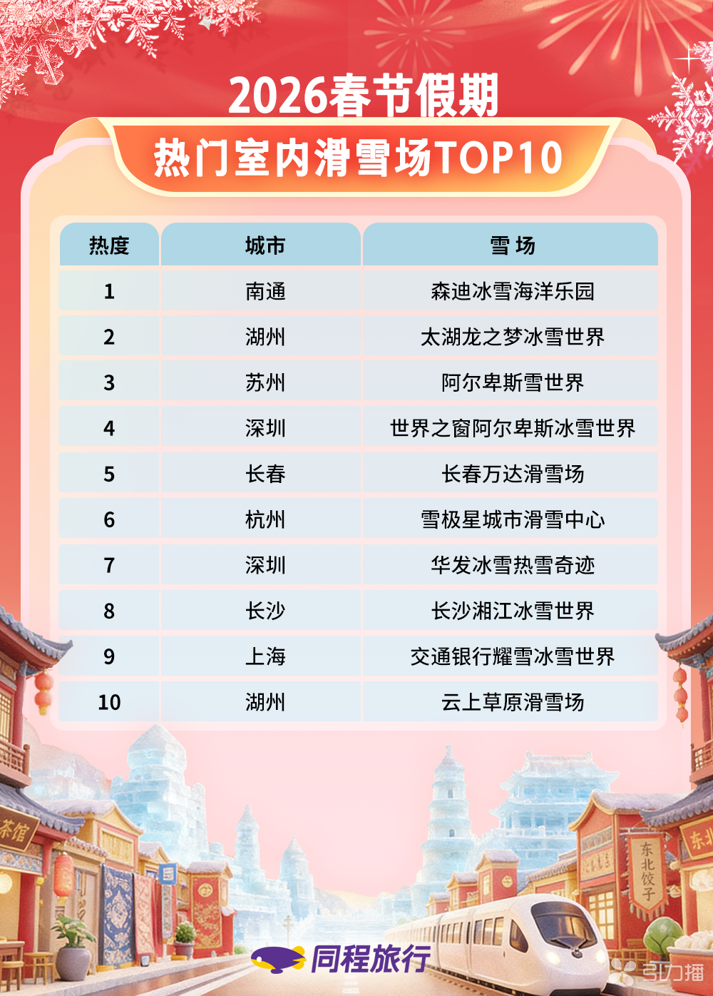 在哈尔滨、长白山、阿勒泰、张家口等地冰雪游需求旺盛的同时,家门口的室内滑雪场也是许多人春节假期体验滑雪运动的好地方。数据显示,多座新开业的大型室内滑雪场成为本地冰雪文旅消费的大热门,苏州阿尔卑斯雪世界在2026春节假期热门冰雪游热门目的地TOP榜单中位列第三。