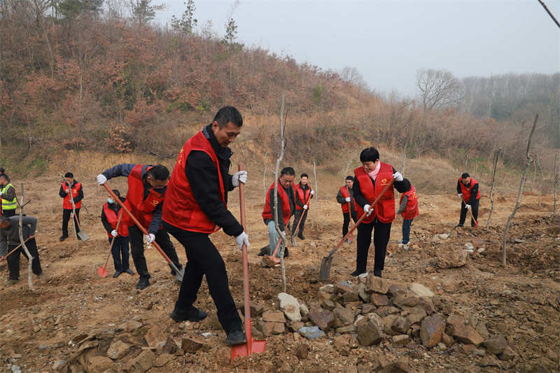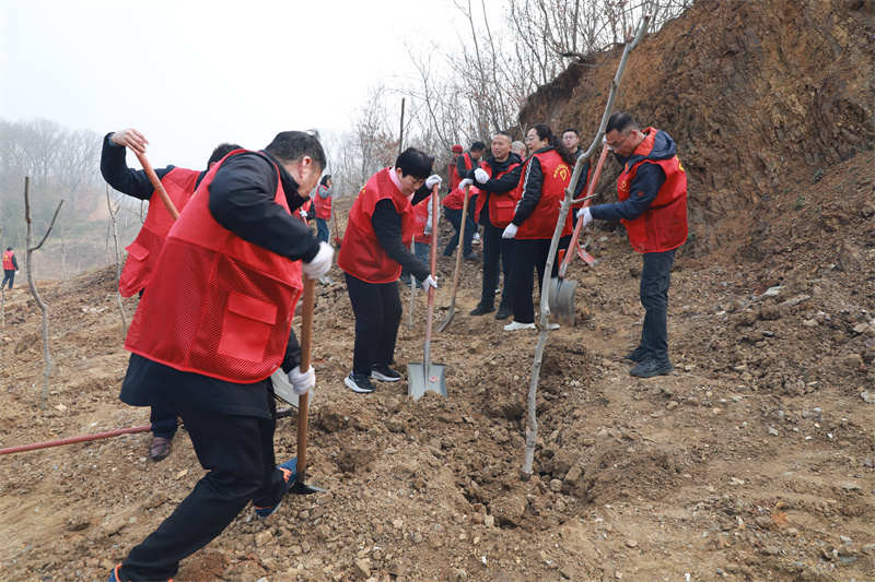 活动现场,干部职工热情似火、干劲十足,自发组队、分工协作,整个植树过程忙而有序、配合默契。大家或躬身铲土,稳稳挖出大小合宜、深浅适中的树坑;或小心翼翼将树苗放入坑中,扶正培土,压实固稳。经过一番辛勤劳作,200余棵树苗迎风挺立,为春日的乡村勾勒出一抹清新盎然的绿意。