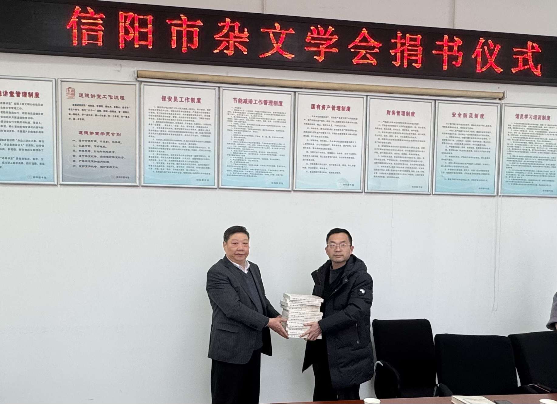 仪式上,王西亮介绍了《信阳市杂文学会作品选》的编纂出版情况。该书汇集了信阳杂文创作的优秀成果,是本土文化建设的重要体现。随后,王西亮代表学会完成捐赠。