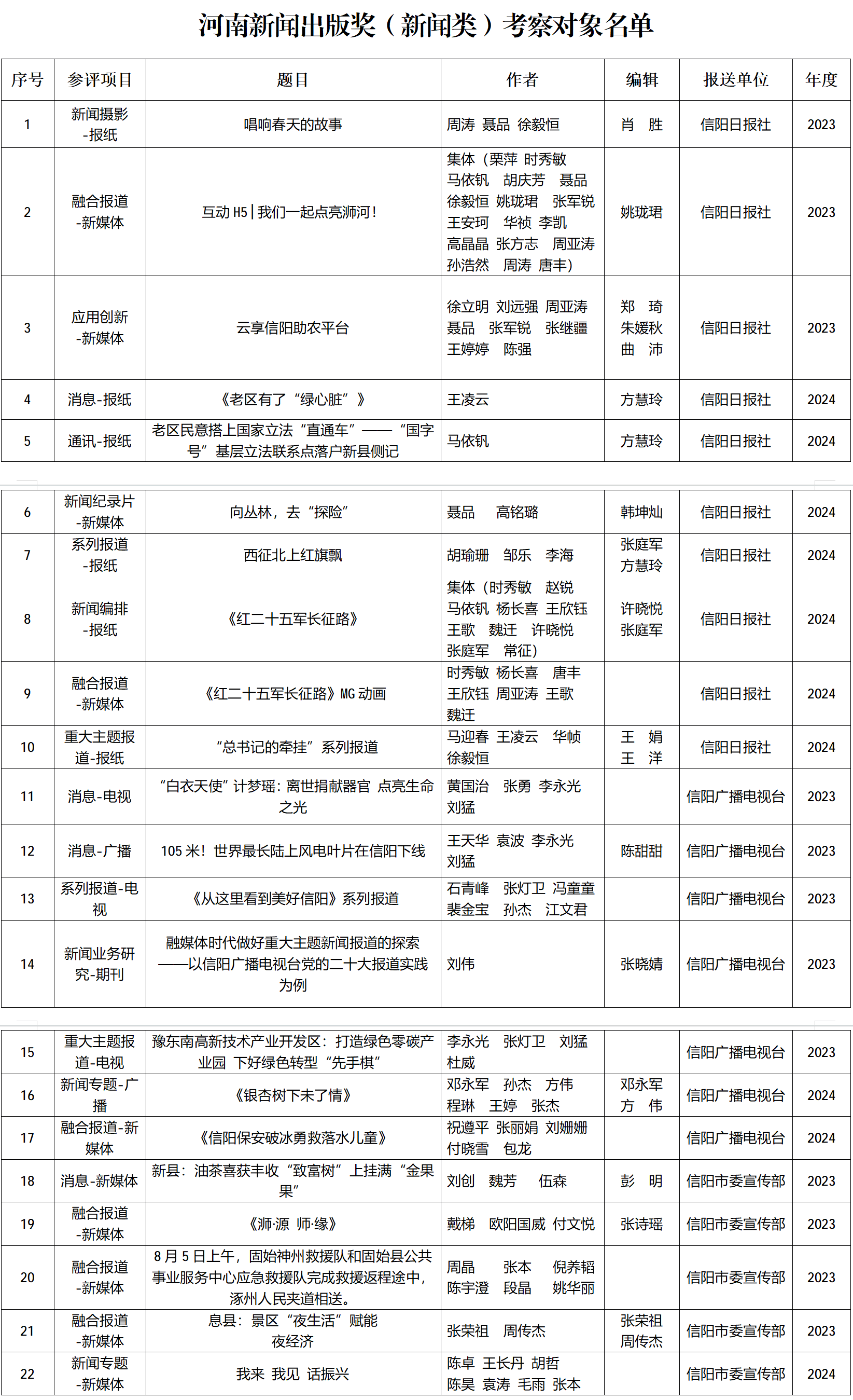 信阳市河南新闻出版奖(新闻类)考察对象名单公示