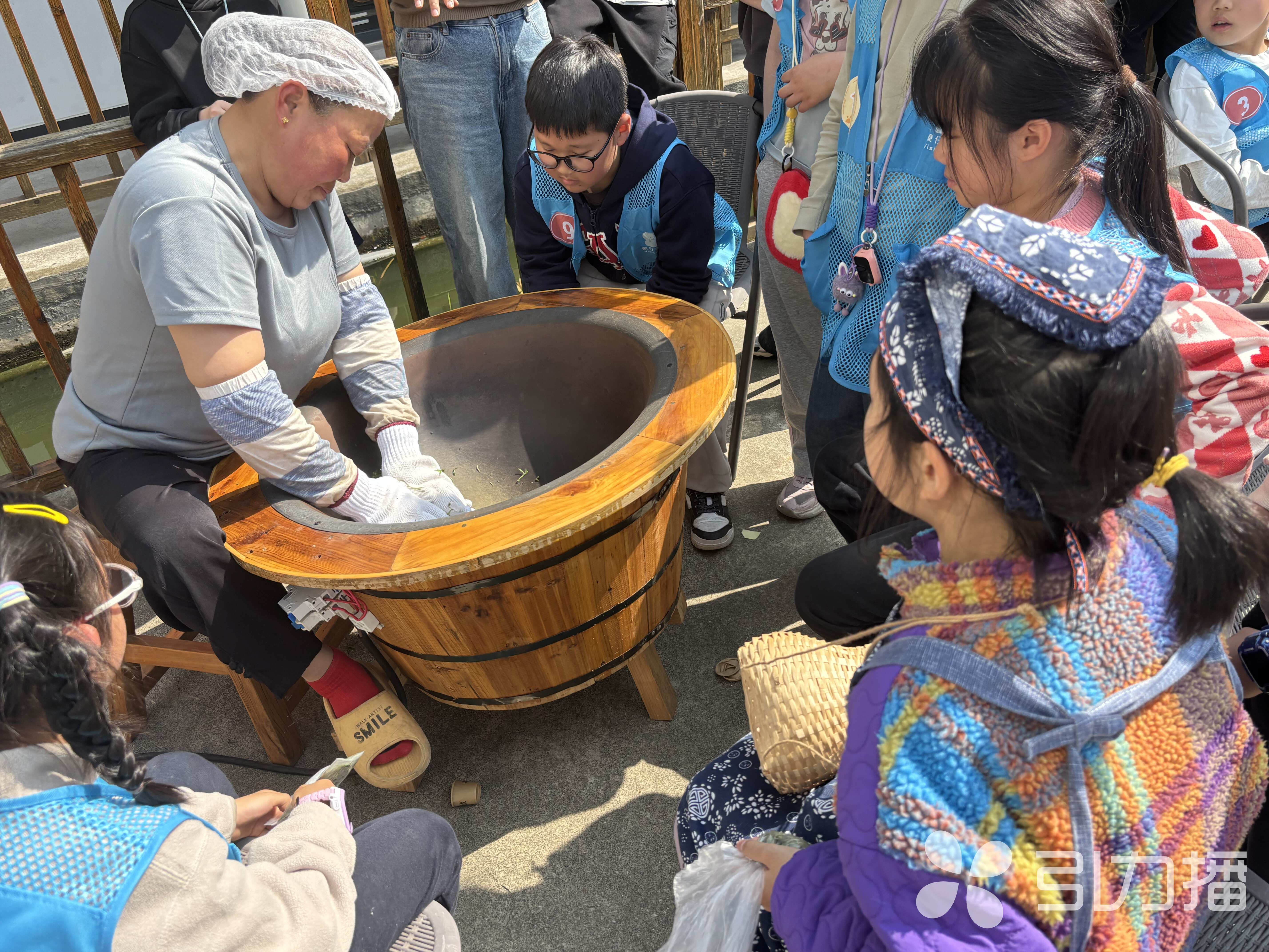 除了亲手采茶,孩子们还现场聆听茶文化、观摩古法炒茶。从洞庭山独特的地理优势,说到碧螺春“形美、色艳、香浓、味醇”的品质特点,孩子们听得津津有味。现场观看炒茶师傅的古法炒制技艺时,滚烫的铁锅旁,炒茶师傅双手在锅中快速翻飞、揉捻茶叶,嫩绿的茶青在高温下渐渐卷曲成螺,浓郁的茶香扑面而来。孩子们围在灶台边,目不转睛地看着师傅娴熟的手法,连连发出惊叹。