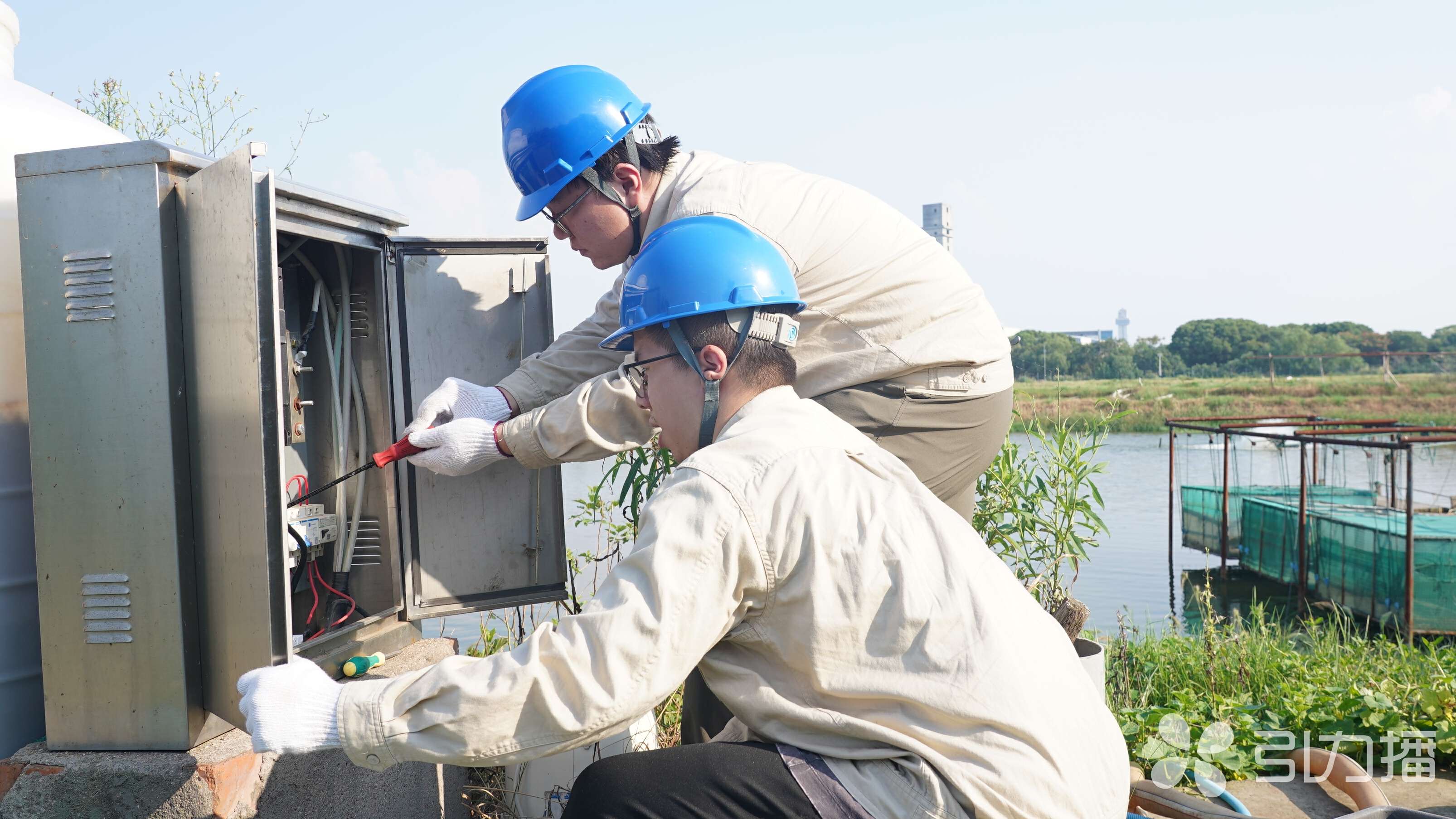 一大早,共产党员服务队队员沈秋风、宋利强就背着电力检查工具,来到李玉宝的蟹塘边,为基地进行全面的电力“体检”。从配电箱到增氧设备,从线路老化到漏电保护,队员们仔细排查每一处隐患,为蟹苗的安全成长保驾护航。
