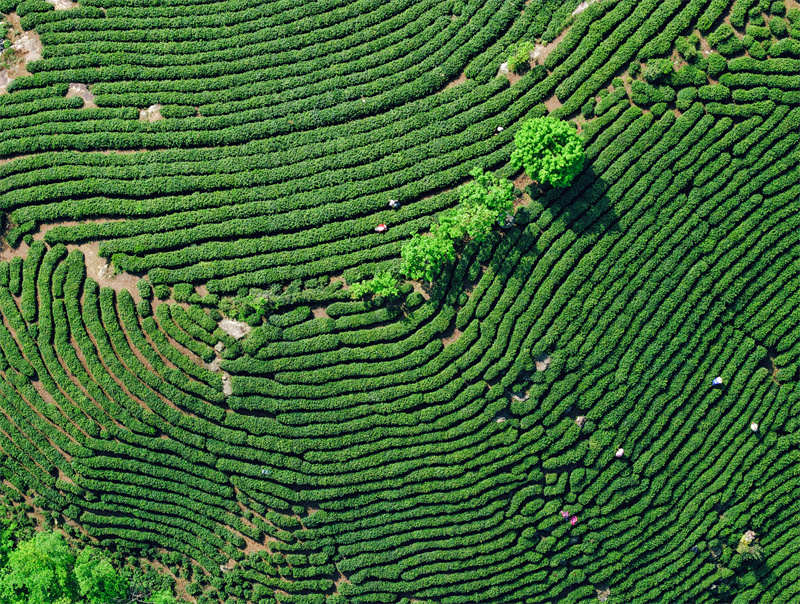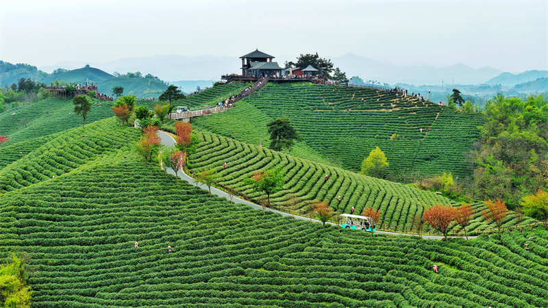 不是一种绿,是多种绿挤在一处:嫩芽初绽的鹅黄绿,老叶沉稳的墨玉绿,雨后反光的油亮草绿,被阳光晒透的浅碧绿……一垄压着一垄,一山叠着一山,万亩生态茶园沿山势铺展,游客驻足于观景平台,俯瞰茶海翻涌,千年茶脉在此静静流淌。