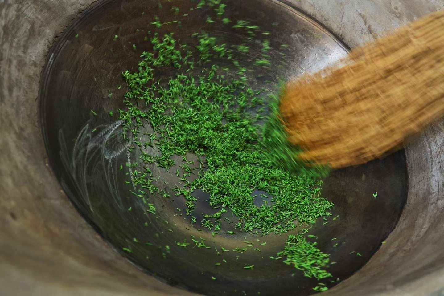 竹篓卸下,鲜叶直送车间。杀青、揉捻、理条、烘干……铁锅滚烫,青气蒸腾,一锅锅新茶在火候、力度与时间的精准把控中悄然成形。这是信阳毛尖产业链最坚实的起点。