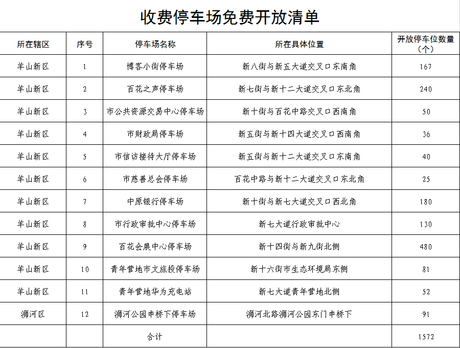 为更好满足广大游客及市民群众在第34届信阳茶文化节与“五一”假期的停车需求,市城市管理局统筹协调中心城区停车资源,推出26个停车场、2825个停车泊位,其中,14家机关事业单位内部停车场开放1253个停车泊位,12处收费停车场开放1572个停车泊位。2026年4月28日至5月5日期间,广大游客和市民可免费停放。