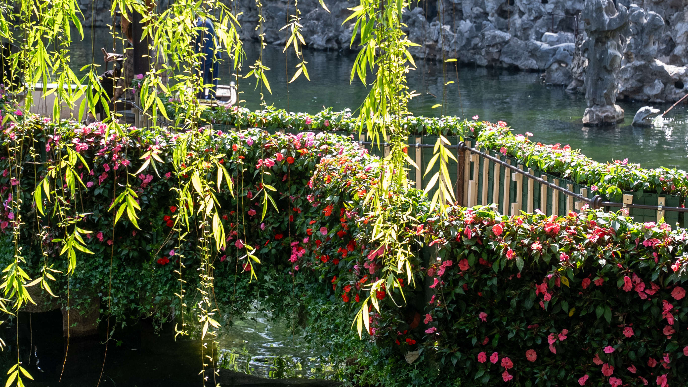 九曲桥畔,多色凤仙花如彩虹瀑布倾泻而下,花影倒映水面,虚实相映、灵动盎然。立雪堂里又是另一番味道,三角梅、细叶棕竹与湖石小品相映成趣,石畔生花、雅趣天成,这种“石配花、花衬景”的搭配,既有古典园林的精致,又透着几分自然野趣。