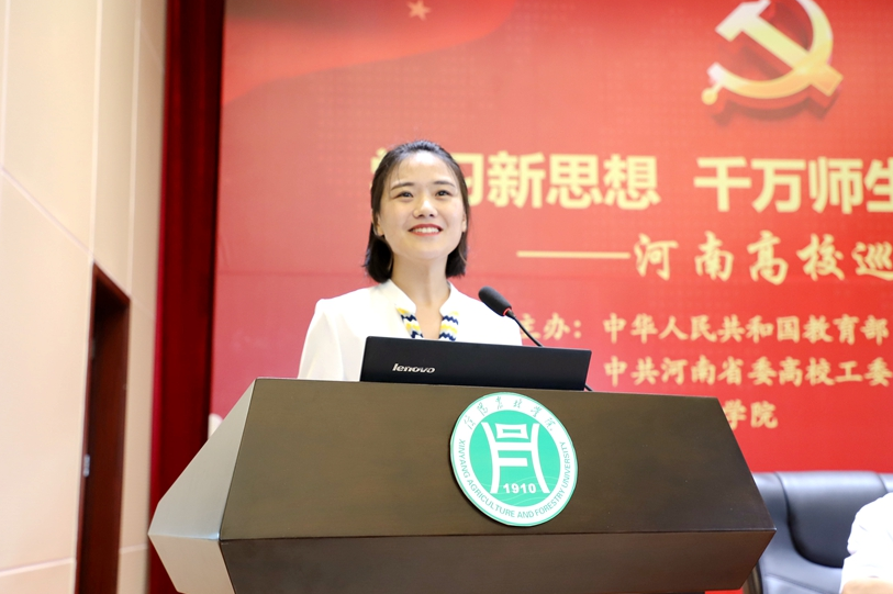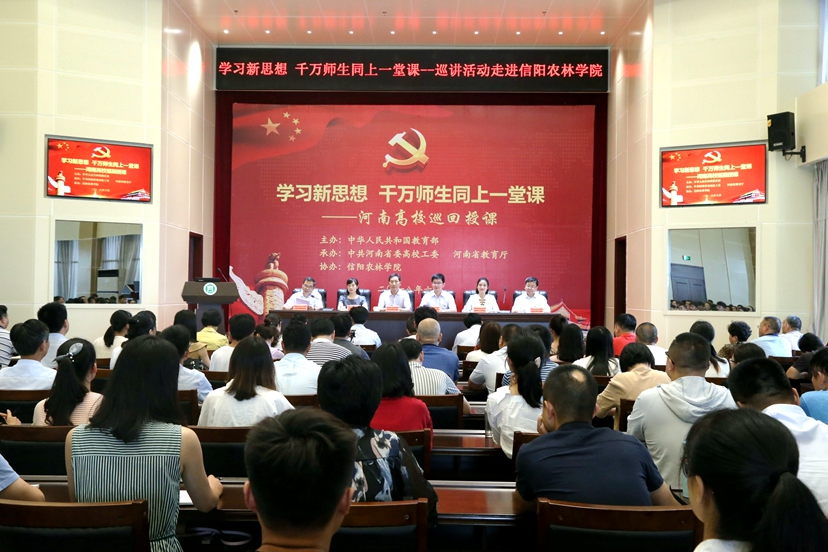 近日,“学习新思想 千万师生同上一堂课”河南高校巡回授课活动在信阳农林学院图书馆六楼报告厅举行。河南省高校巡回授课宣讲团成员河南科技大学马克思主义学院院长刘振江教授、河南农业大学辅导员黄笑、河南科技学院辅导员栗宁、河南城建学院辅导员张航为该校师生作专题宣讲。
