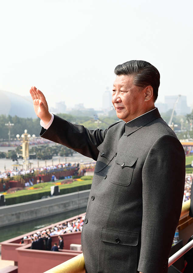 10月1日,庆祝中华人民共和国成立70周年大会在北京天安门广场隆重举行。中共中央总书记、国家主席、中央军委主席习近平发表重要讲话并检阅受阅部队。这是习近平在天安门城楼上。 新华社记者 鞠鹏 摄