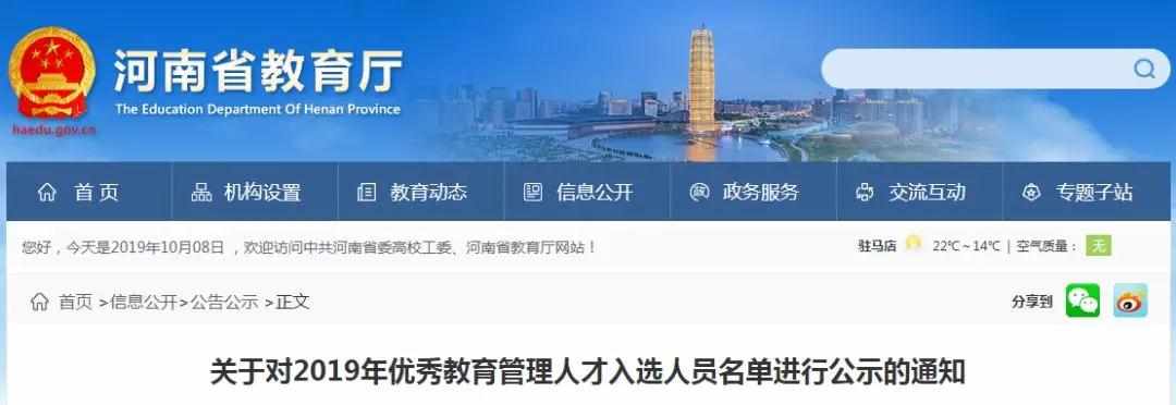 根据河南省教育厅《关于做好2019年优秀教育管理人才人选推荐工作的通知》(教办人〔2019〕399号)要求,全省各级教育行政部门、各高等学校、省属各中等职业学校和教育厅直属各学校高度重视,严格按照选拔条件和程序,认真细致地开展了基层推荐工作。经省教育厅组织专家审核评选,决定将白传忠等274人作为2019年优秀教育管理人才人选,现予以公示。