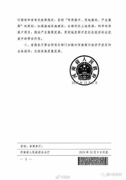 记者今天从信阳市潢川县有关方面获悉,河南省人民政府于12月9日发布文件,对潢川经济开发区扩区进行批复:同意扩区。