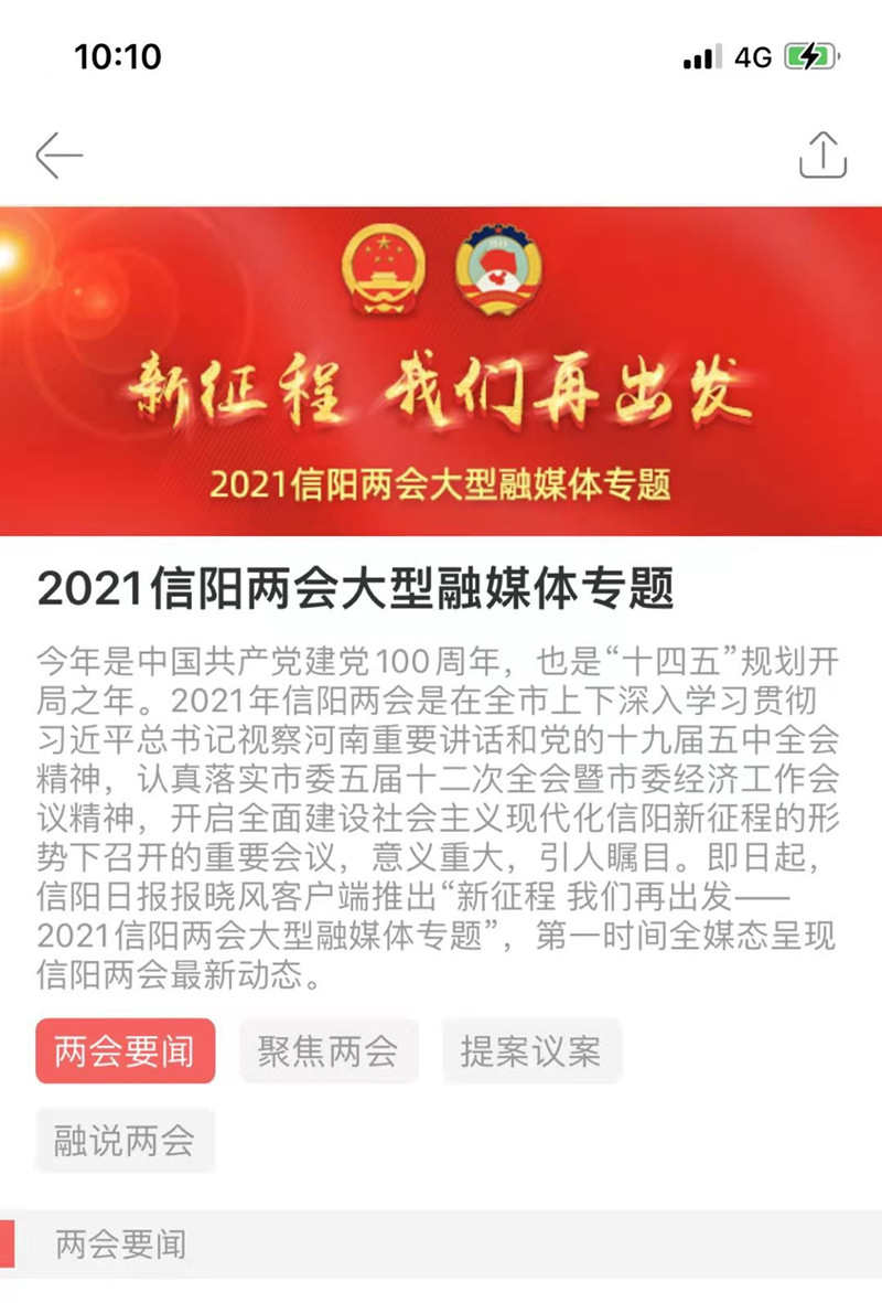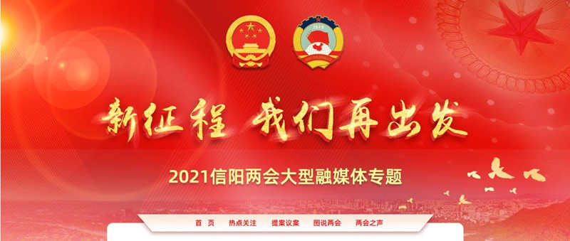 信阳市五届人大六次会议和信阳市政协五届五次会议分别将于6月9日和6月8日开幕。今天,信阳日报传媒集团旗下信阳新闻网和报晓风客户端联动策划推出的“新征程 我们再出发——2021信阳两会大型融媒体专题”正式上线。