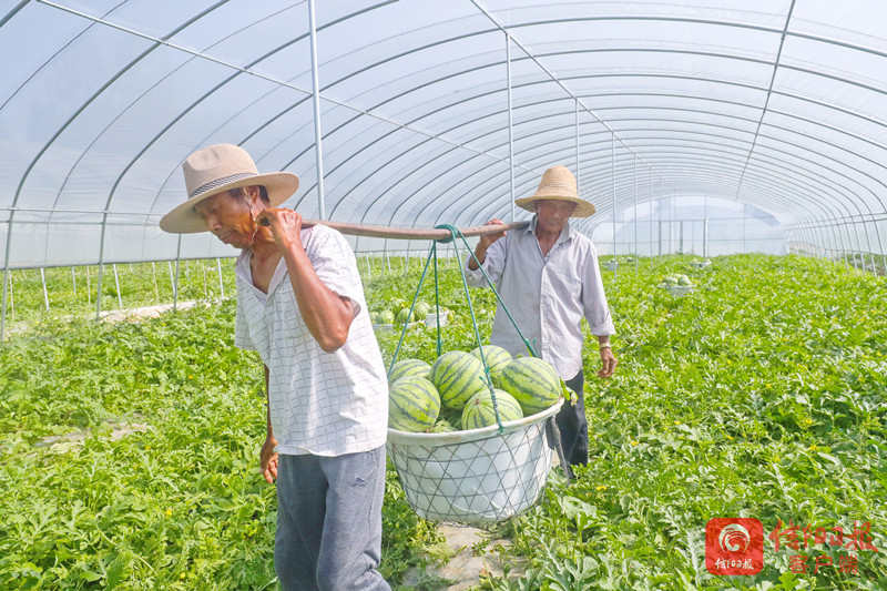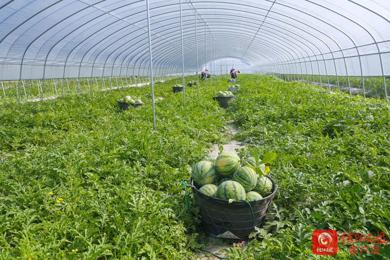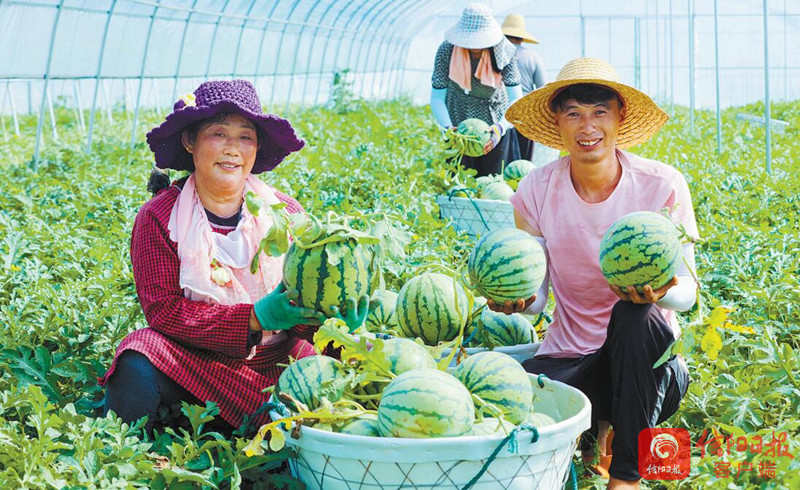 7月20日,光山县孙铁铺镇将楼村村民正在新发地西瓜种植基地收获西瓜。该基地以“基地+农户”的种植管理模式,今春引进种植连片西瓜,亩均收入可达到8500元。通过土地流转、返聘务工、入股分红等方式实现农民多元化增收,同时种植基地吸纳周围50余名贫困群众在家门口种植西瓜就业增收,让种植西瓜托起农民致富梦。 谢万柏 摄