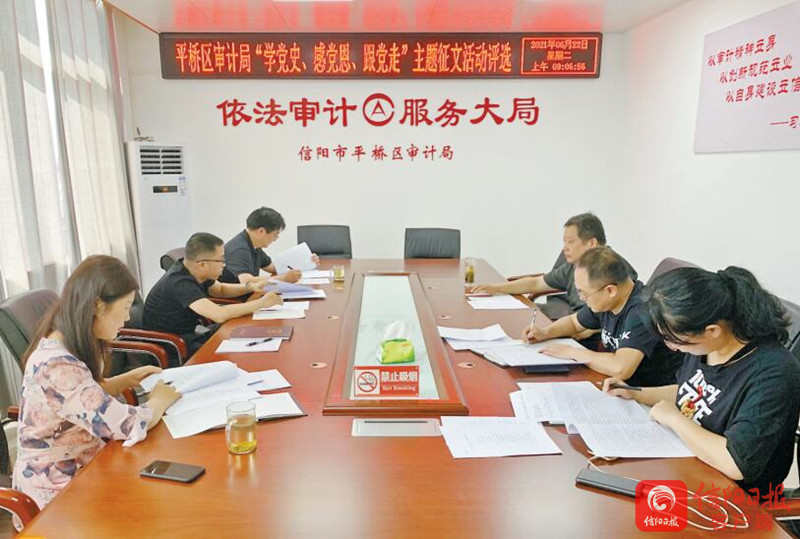 为全面展示审计干部职工听党话、跟党走,为党的事业不懈奋斗的情怀与决心,近日,平桥区审计局组织开展党史学习教育主题征文活动,全局干部职工积极参与、踊跃报名。经征文评审会评选,最终12篇参赛作品获得全局表彰。陈 雪 摄