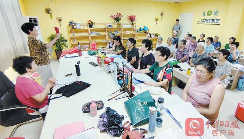 “我和我的祖国,一刻也不能分割……”7月23日下午,室外气温30多摄氏度,而三五八社区党群服务中心2楼的生活微课堂里阵阵清爽,30多名老年人聚集在一起引吭高歌。社区党委书记陈德玉介绍,这是三五八社区平均年龄70岁以上的老年朋友组成的老年合唱团在学、练红歌。