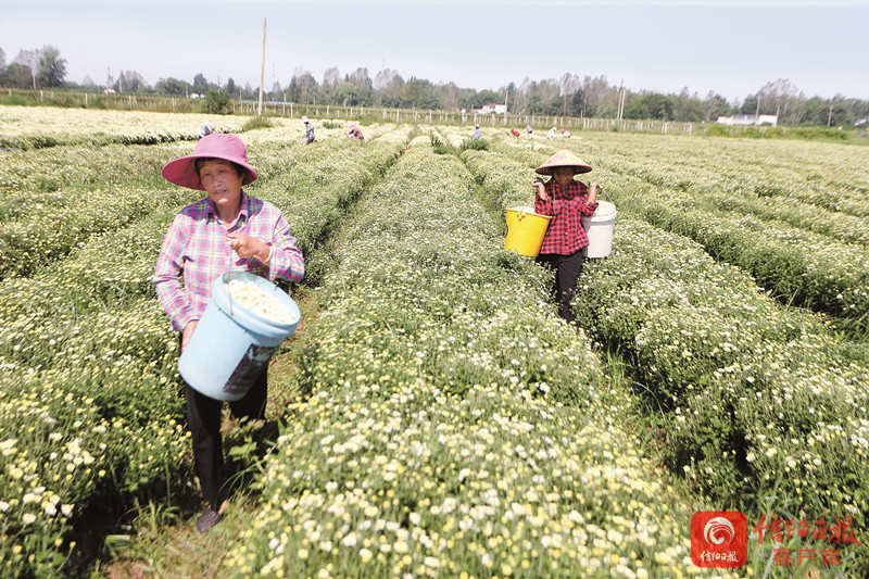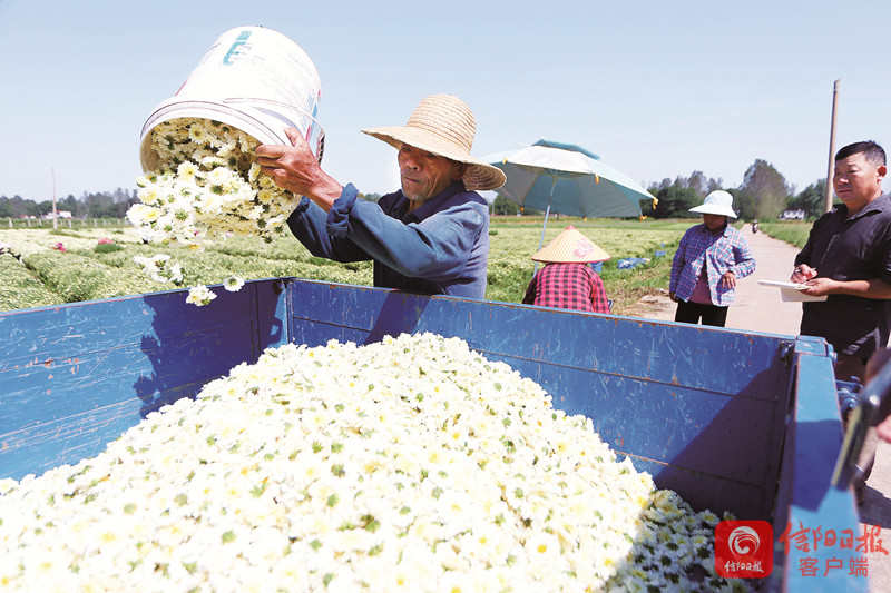 满坡金蕊遍地黄,秋风习习菊花香。眼下,正值北京菊和杭白菊盛开采收的季节,在平桥区彭家湾乡陈寨村的菊花种植基地里,百余亩饱满绽放的菊花汇成花的海洋,笑容映在穿梭花海的村民们脸上,成为亮丽的风景。